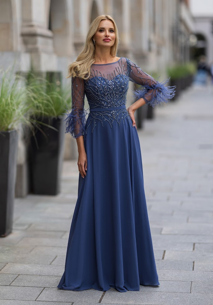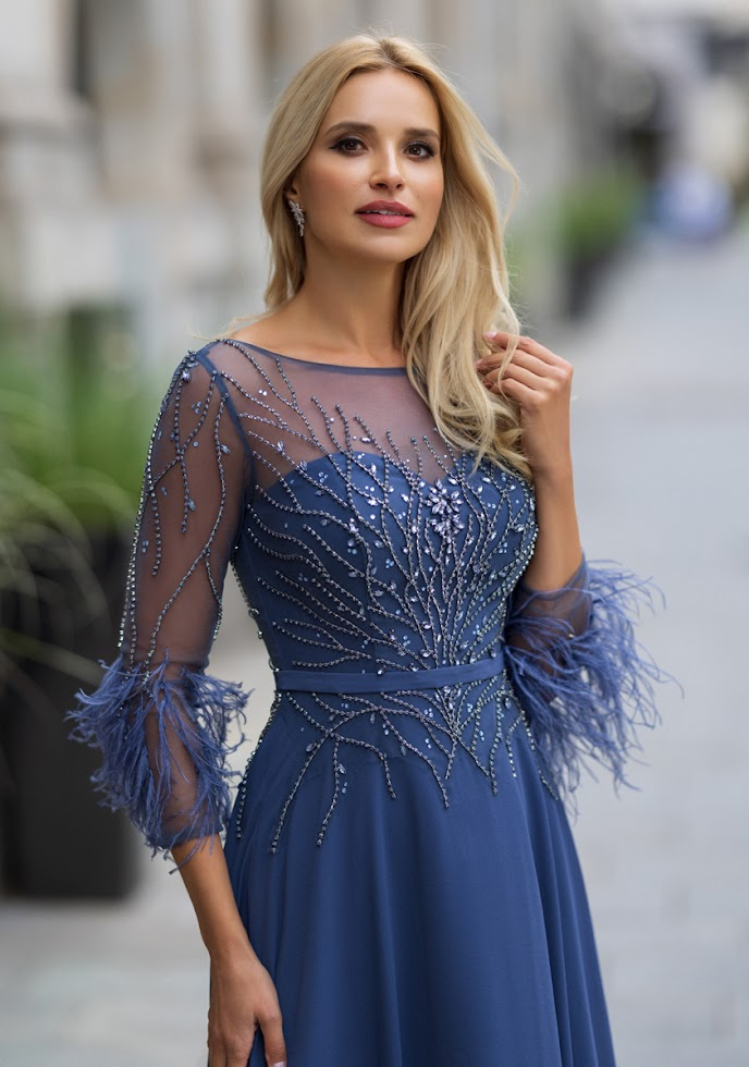 Dolga modra obleka iz lahkotnega materiala izstopa s prosojnim životcem, okrašenim z drobnimi bleščečimi detajli. Mehko krilo, poudarjen pas in peresni zaključki na rokavih ustvarijo romantičen videz z razkošnim pridihom.
