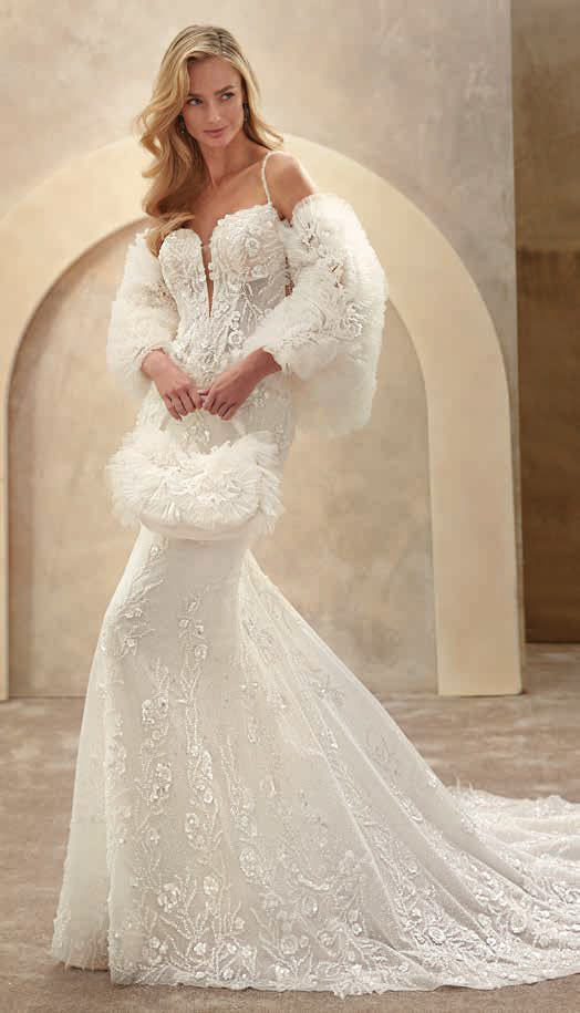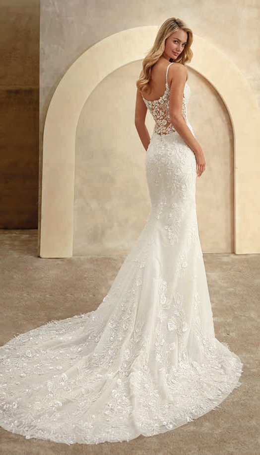 Oprijeta poročna obleka s tankimi naramnicami in globokim izrezom je bogato okrašena s cvetličnim vezenjem in bleščicami. Hrbtni del krasi prosojna čipka z odprtimi detajli, ki se preliva v dolgo, zaobljeno vlečko z bleščečimi vzorci.