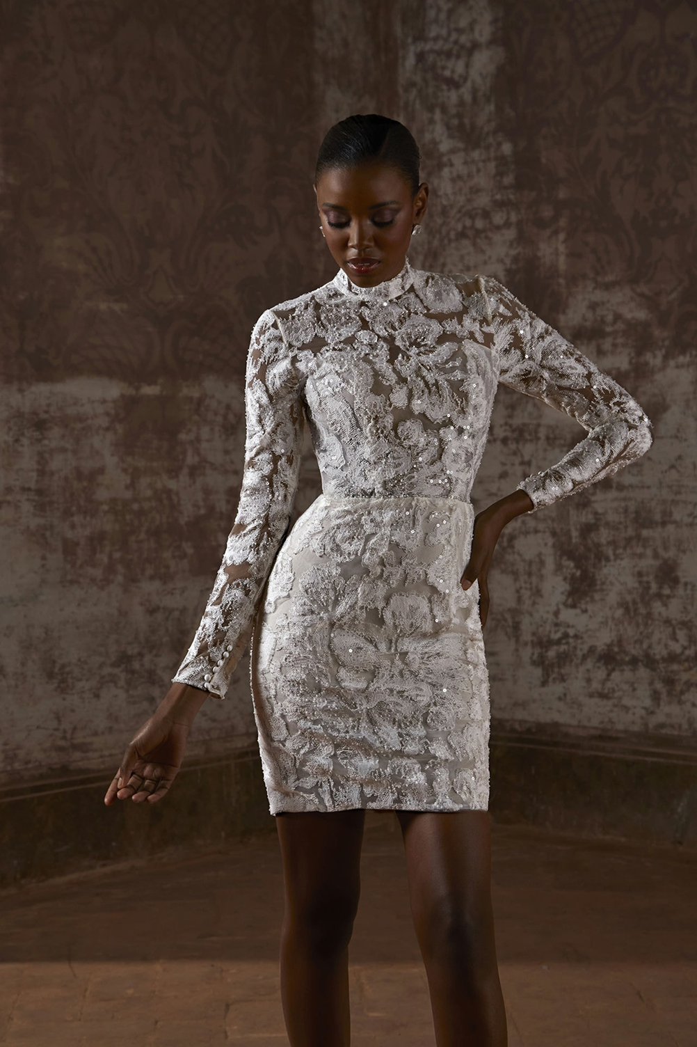 Razkošna balska obleka z dolgimi rokavi, prosojnim izrezom in bogato čipko. Volumen krila in dramatično odprt hrbet zagotavljata nepozaben vstop, poln čara in prestiža.