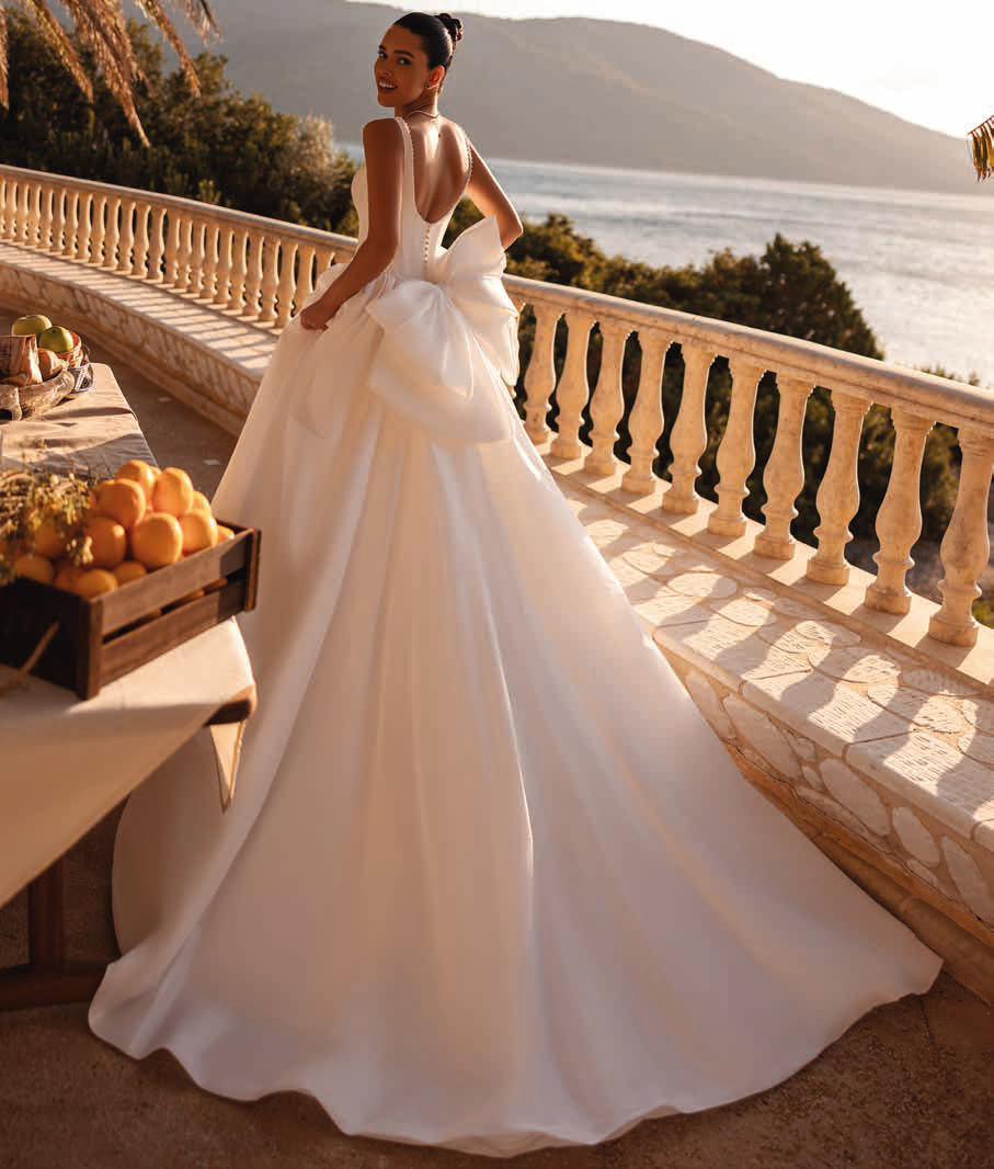 Prefinjena balska obleka s kvadratnim izrezom poudari pas, krilo pa ustvari volumen. Hrbet z gumbki in predimenzionirano pentljo celotnemu videzu doda popoln končni pečat.