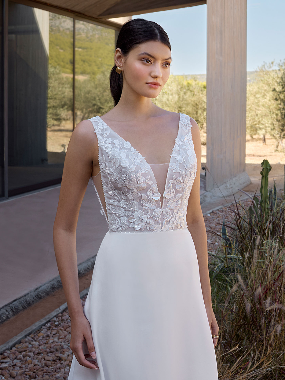 La parte superiore dell'abito da sposa è caratterizzata da una profonda scollatura a V e da un corpetto traslucido decorato con piccole cravatte floreali. La parte posteriore è profondamente tagliata a V e la gonna liscia si allunga fino a formare un delicato ciuffo sul retro.