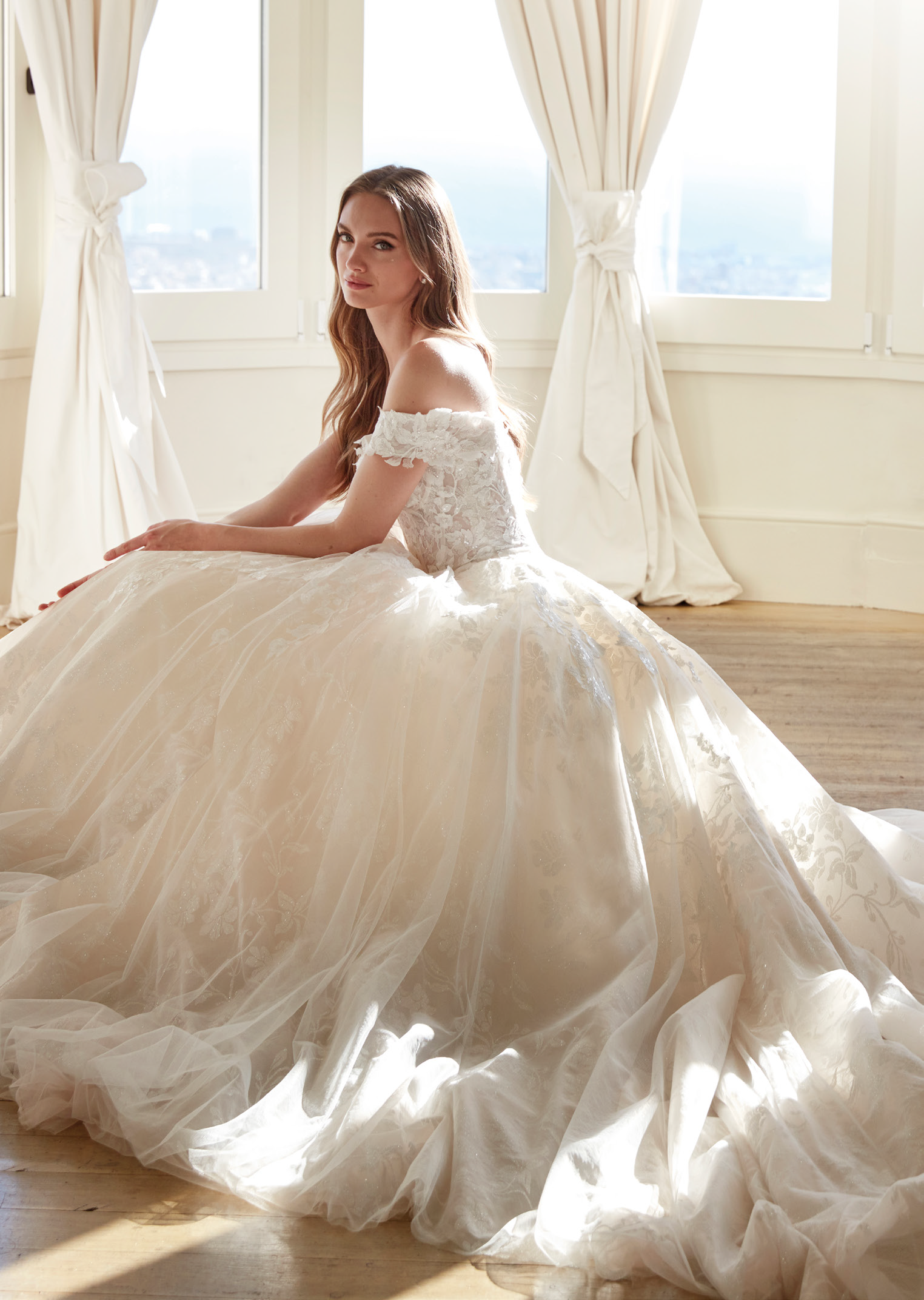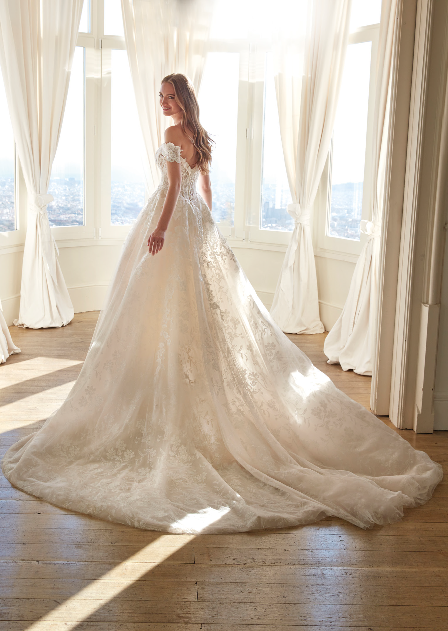 Obleka v princes kroju s steznikom in razkošnim krilom iz tila, čipke in bleščic. Vleček dolg 220 cm in bogati detajli iz perlic ustvarjajo pravi pravljični trenutek.