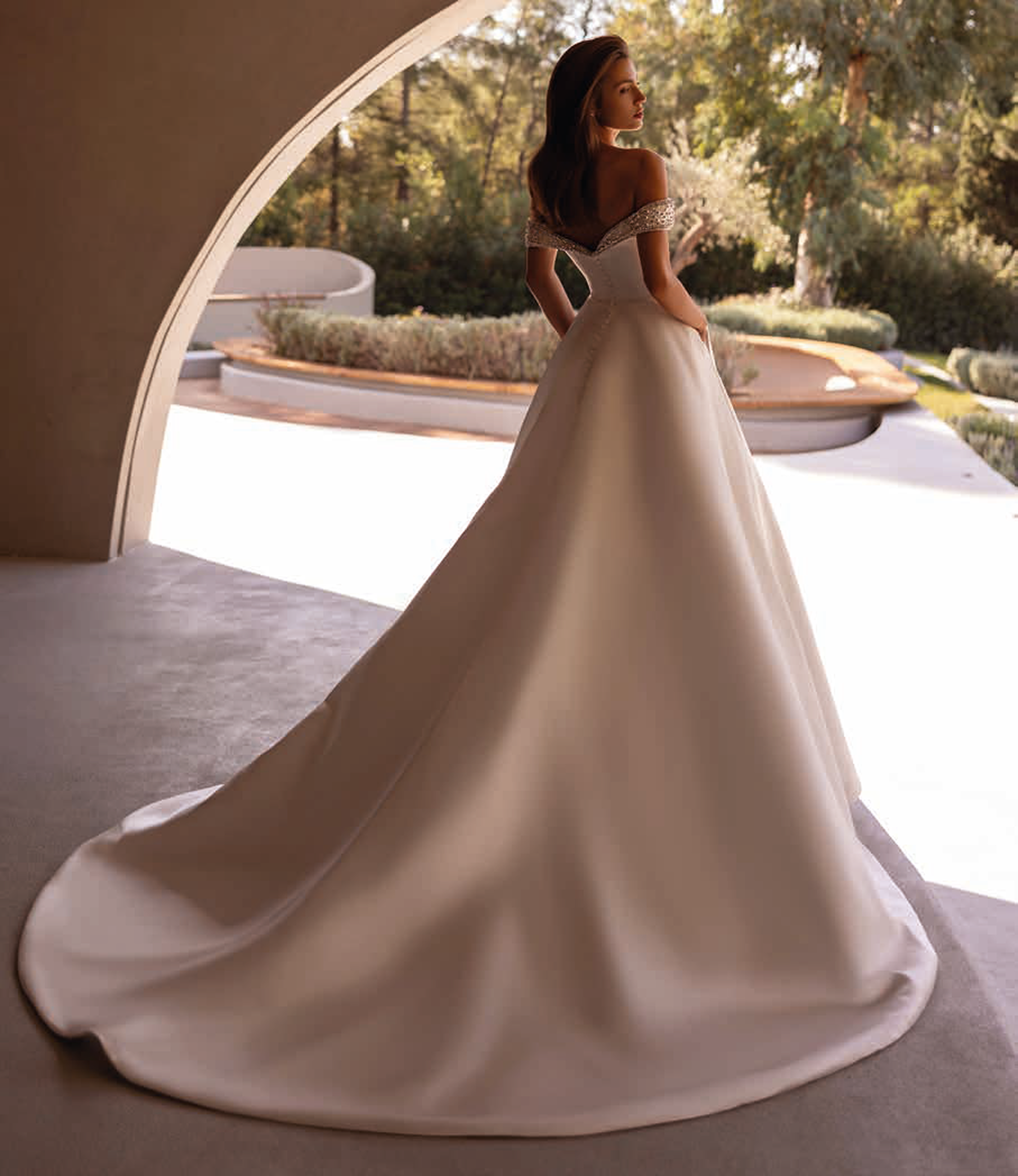 Ta obleka združuje čiste linije mikada ali satena s prefinjenimi, diskretnimi detajli, ki poudarjajo nežno gracioznost.